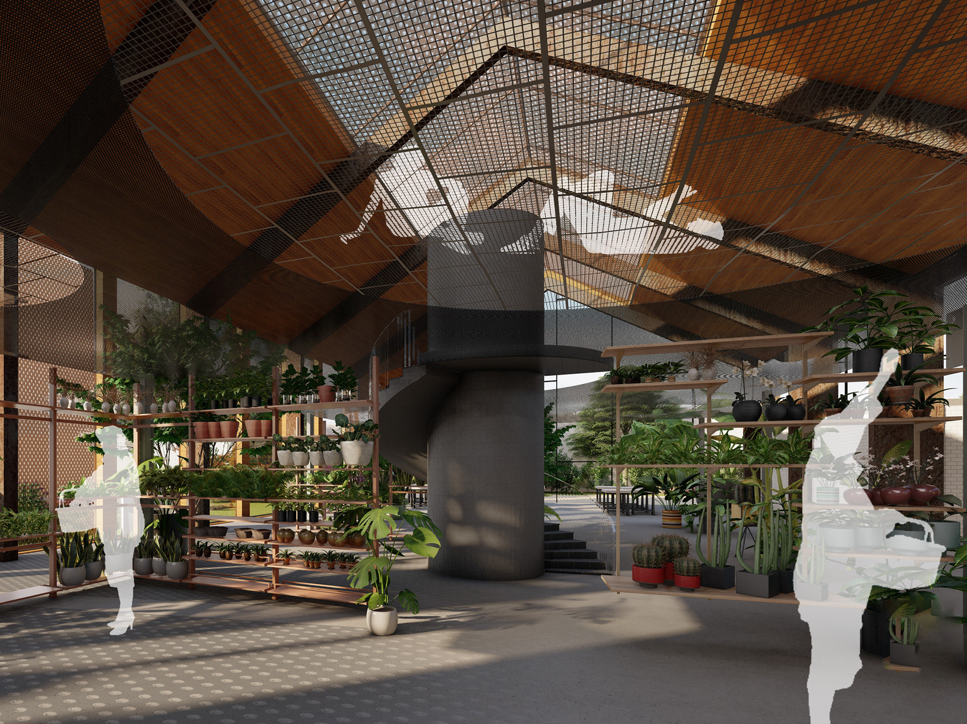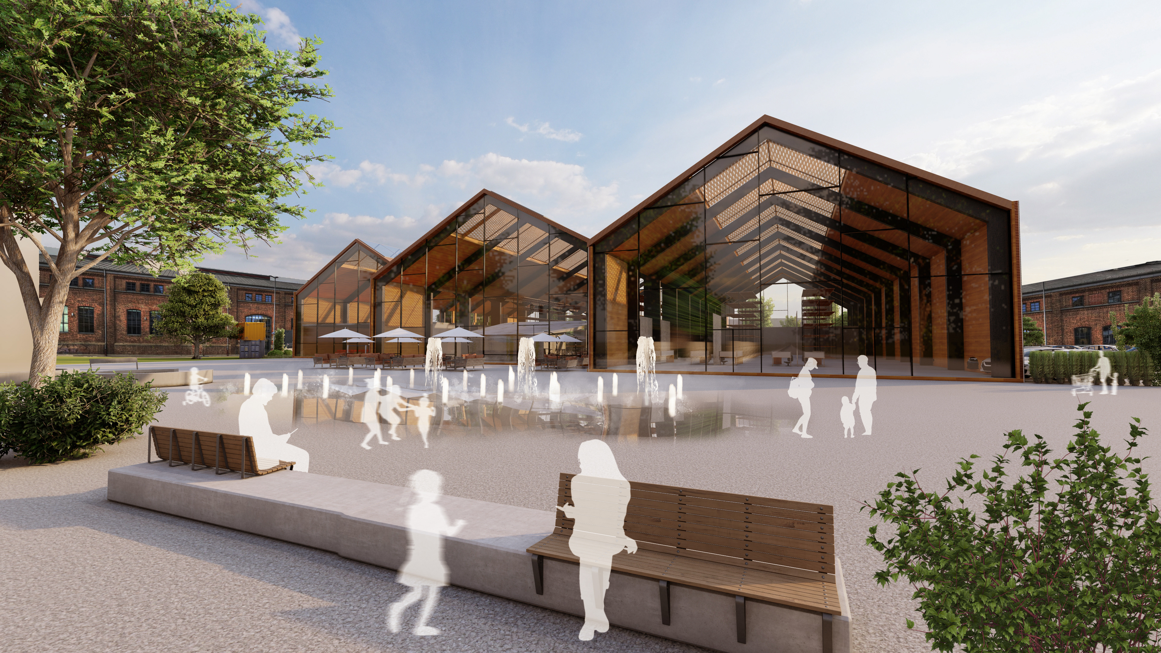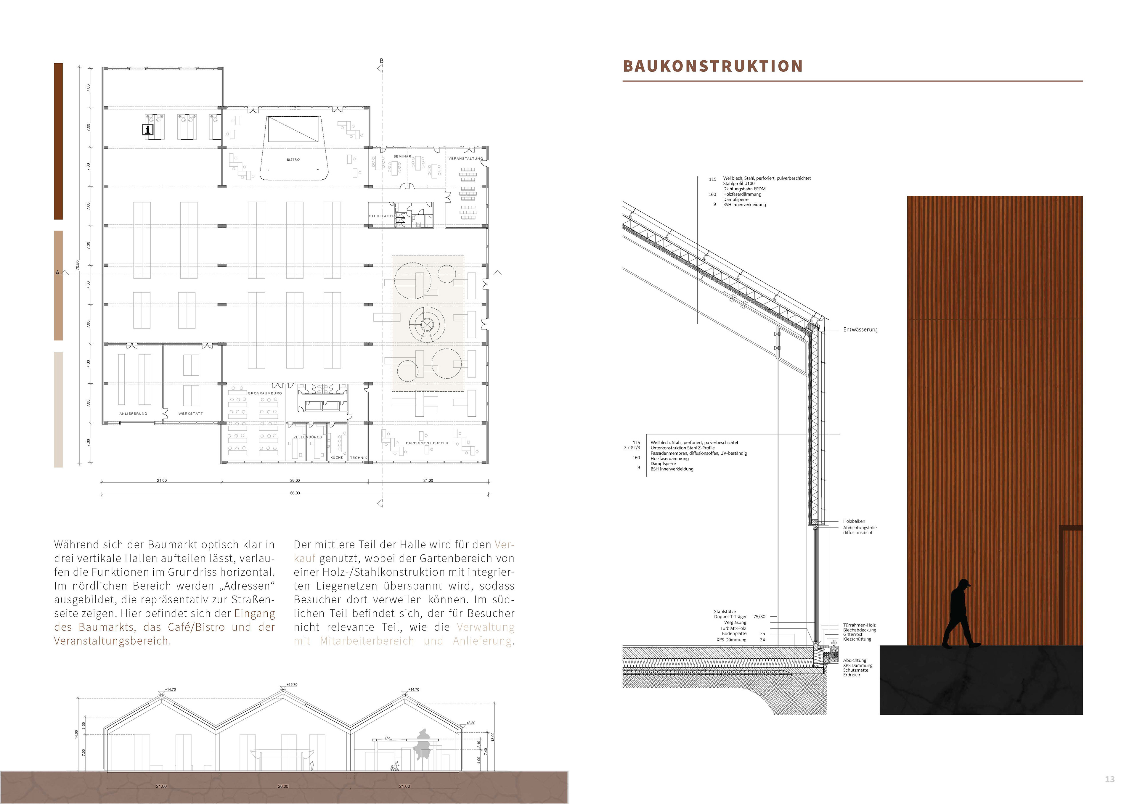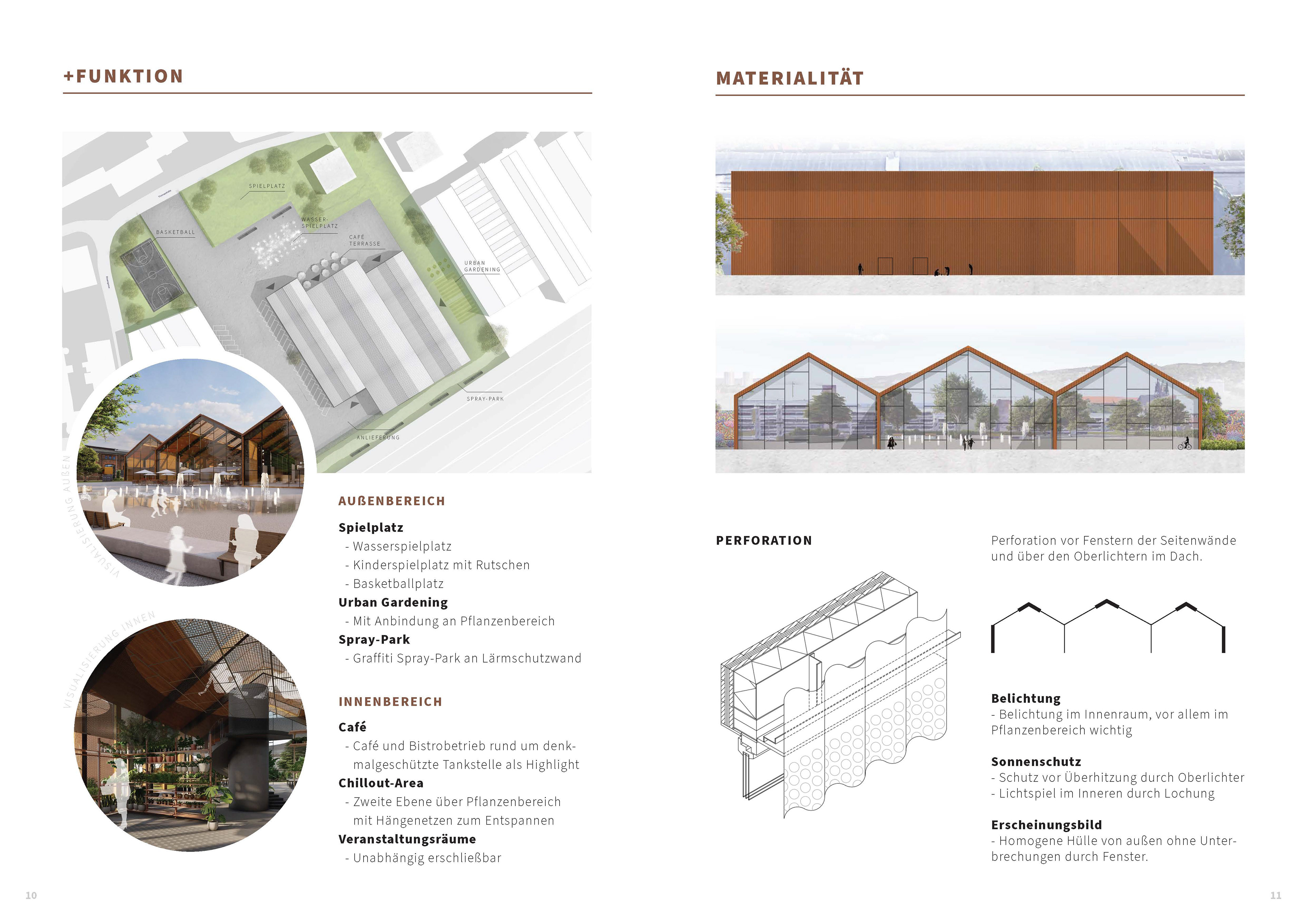 Das Konzept „Baumarkt+“ erweitert die klassische Verkaufsfläche um vielfältige Zusatzfunktionen im Innen- und Außenbereich. Von einem Café in einer denkmalgeschützten Tankstelle über einen Spray-Park bis hin zu Urban-Gardening-Flächen entsteht ein hybrider Ort der Begegnung.