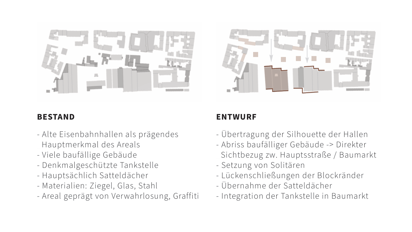 Dieses Projekt widmet sich der Neugestaltung eines brachliegenden Areals durch die Symbiose aus großflächigem Gewerbe und urbanem Mehrwert. Die städtebauliche Herleitung basiert auf einer detaillierten Analyse des Bestands: Die charakteristische Silhouette alter Eisenbahnhallen wurde transformiert, um das industrielle Erbe zu wahren und gleichzeitig moderne Nutzungsansprüche zu erfüllen.