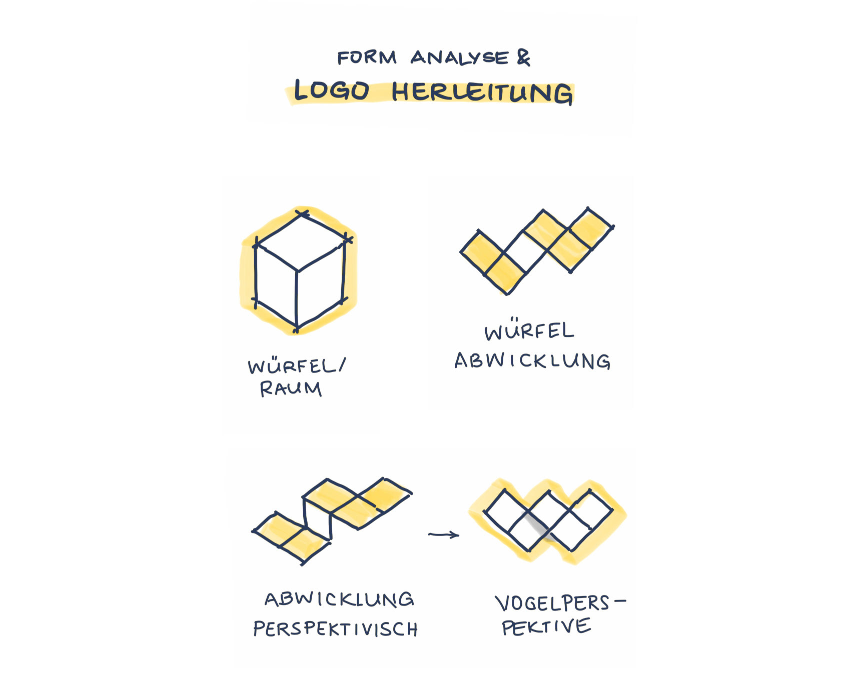 Das visuelle Fundament von Wandelwerk bildet die Geometrie des Raums. Als Ableitung aus der Abwicklung eines Würfels entsteht in der Aufsicht ein abstrahiertes „W“. Dieser Prozess symbolisiert den Kern der Architekturberatung in den frühen Leistungsphasen: Das Entfalten von Potenzialen und das Strukturieren von Visionen im noch „leeren“ Raum.