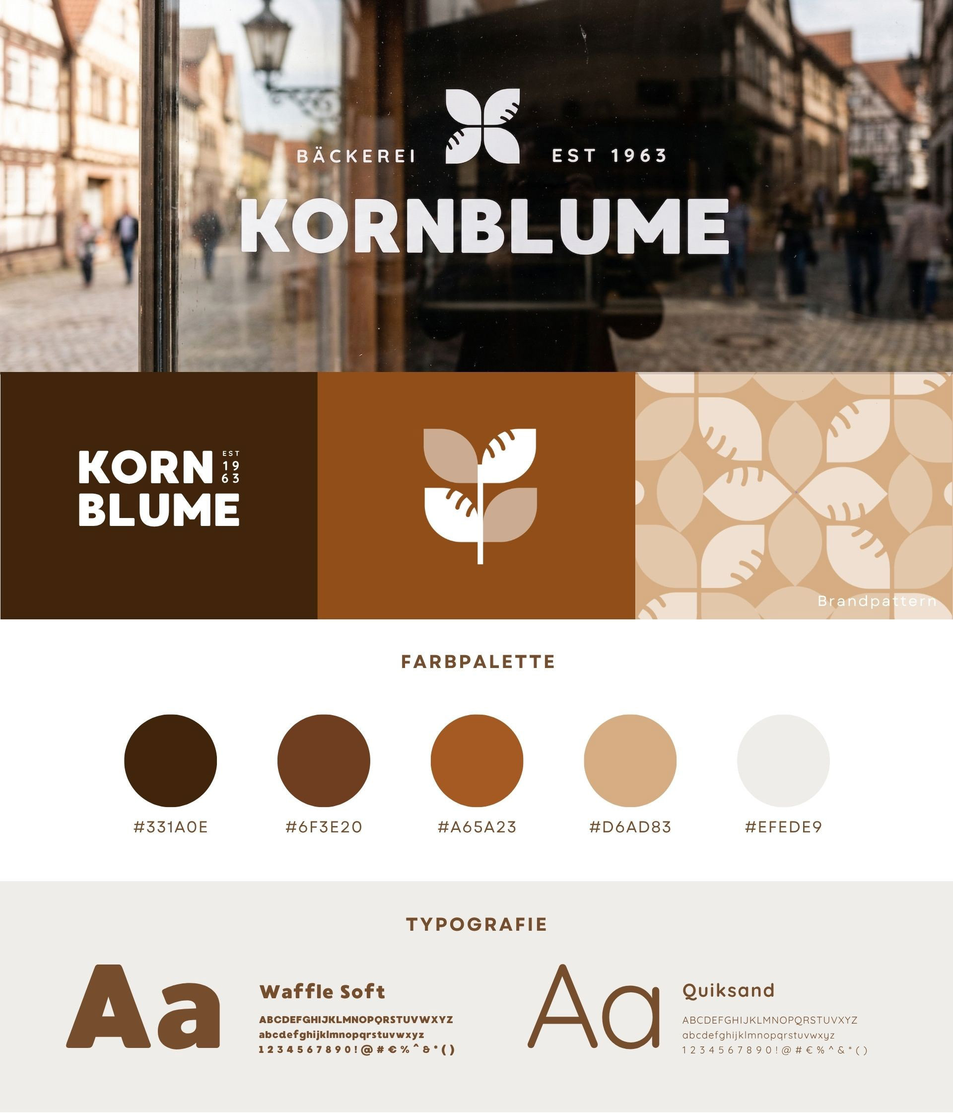 Die Bäckerei „Kornblume“ ist ein Familienbetrieb in der dritten Generation, der für traditionelles Handwerk, lange Teigführung und regionale Zutaten steht. Die Herausforderung dieses Rebrandings bestand darin, das „altbackene“ Image der bestehenden Identität abzulegen und eine Brücke zwischen traditionellen Werten und moderner Ästhetik zu schlagen. Ziel war es, die handwerkliche Essenz zu bewahren und gleichzeitig eine jüngere, qualitätsbewusste Zielgruppe anzusprechen.